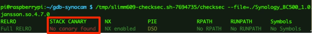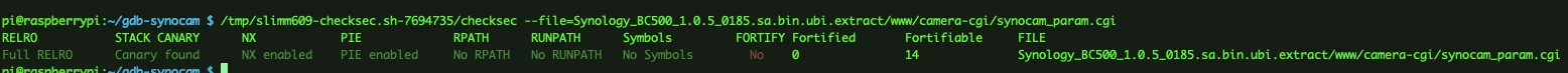 Using checksec, we analyzed the mitigations found in the main program synocm_param.cgi and in the JSON library /lib/libjansson.so.4.7.0. We found that while the main application process has almost all modern binary mitigations enabled including RELRO, NX, etc, the library was not compiled with stack canary protection.