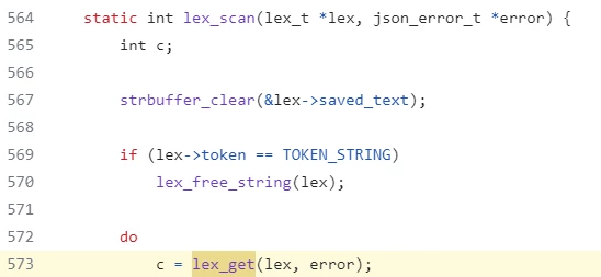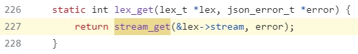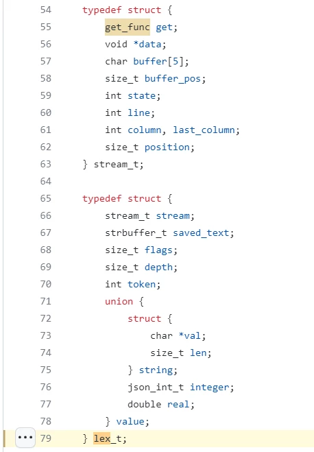 From the open-source libjansson library: lex_t and stream_t structs and the get_func pointer which we override.