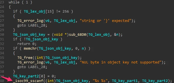 While looking at the implementation of the json_loads function, we noticed a call to a dangerous sscanf function. This C function is considered unsafe, since it could potentially cause memory corruption issues.