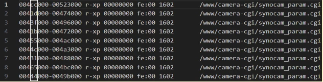 The camera’s OS enforces ASLR as a security measure. This meant we could not rely on static addresses in our exploit payloads. After analyzing the execution of the binary several times, and analyzing the process mapping from /proc/[PID]/maps, we came to the conclusion that the application has 8 bits of address randomness, and that the heap has 12 bits of randomness in its address location.