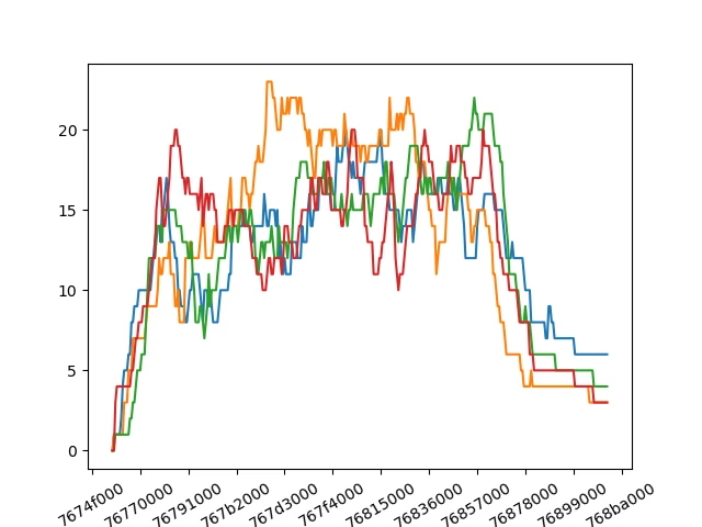 A diagram showing heap region distribution across the memory of the program (each color represents a different session on the device after reboot)