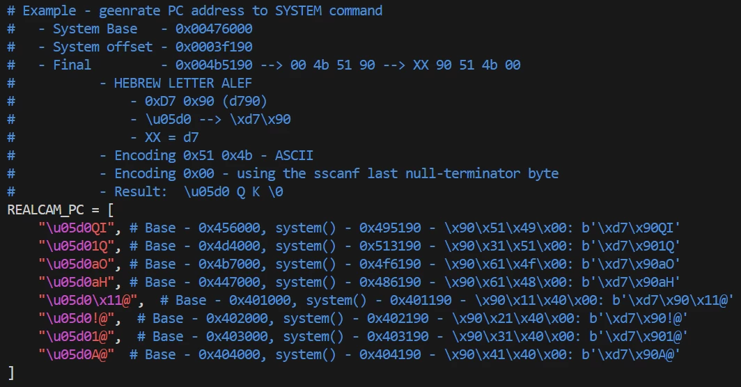 Our payload is composed of different parts, each with different purposes. Two of these parts are the system function address (which is relative to the program base address: <Program-Base> + 0x3f190), and a pointer to the program’s heap region containing our OS command that will be invoked by the system function.