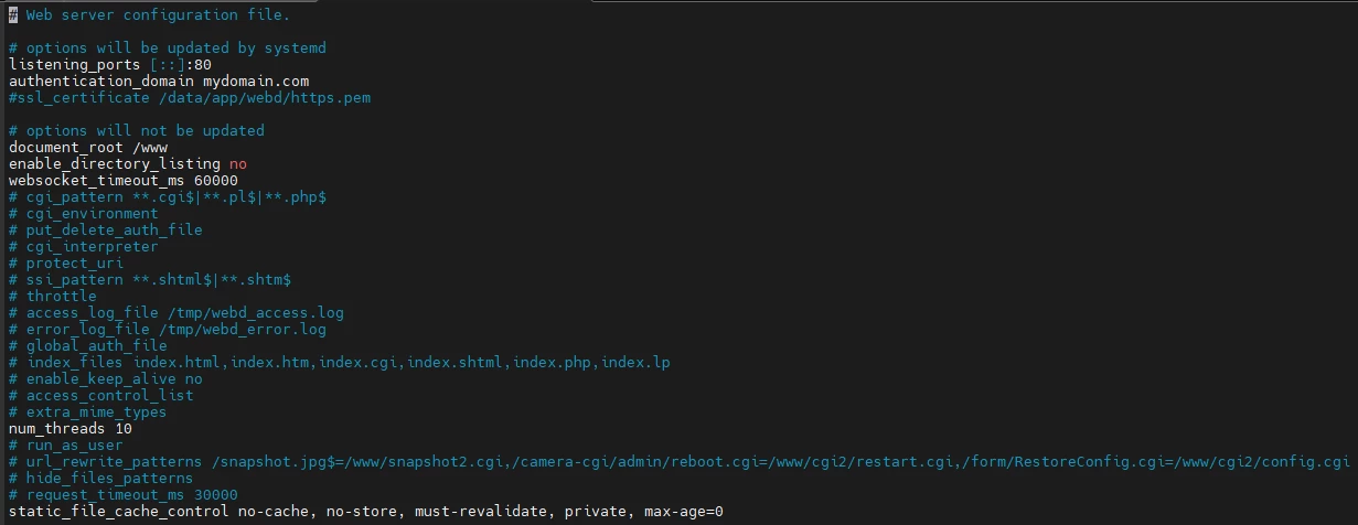 The camera has a web interface which is based on the civetweb web server serving C/C++ based CGI executables. The web server’s configuration is located at /etc/webd.conf and it binds to ports 80 (HTTP) and 443 (HTTPS).