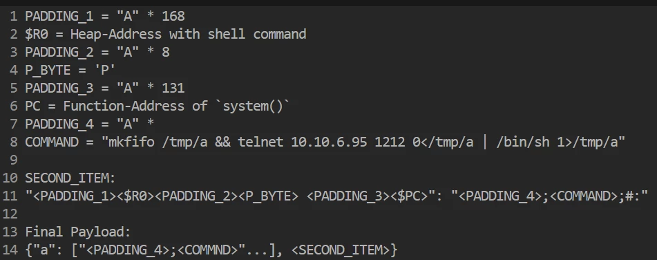 Our payload consists of a JSON object with two items, the first is a key:array[] of 6 strings composed of padding and OS command, and the second triggers the function pointer overflow explained above.