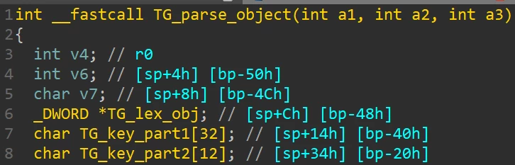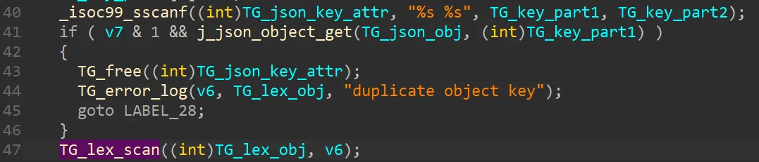 Function decompilation view of the parse_object(), calling sscanf with user input and then calling the TG_lex_scan function